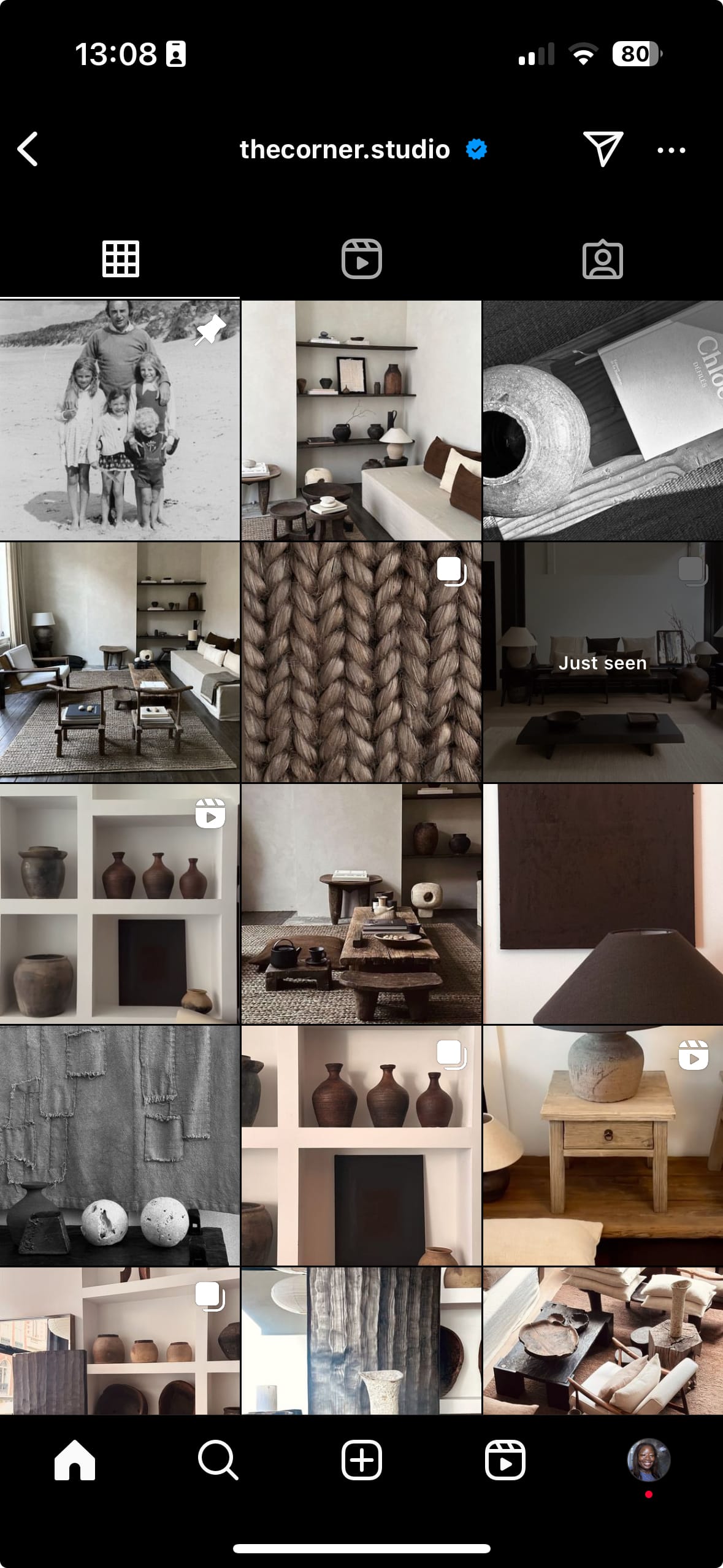 To maximize your efforts, focus on creating a strategic balance between reach (Reels) and deeper engagement (carousels). Interior design studio @thecorner.studio mixes static, carousel, and Reels posts for a cohesive feed.
