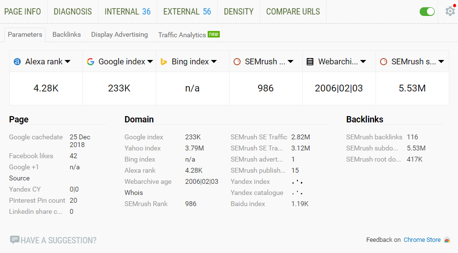 This extension provides quick access to the most important SEO stats. The tool will show you: