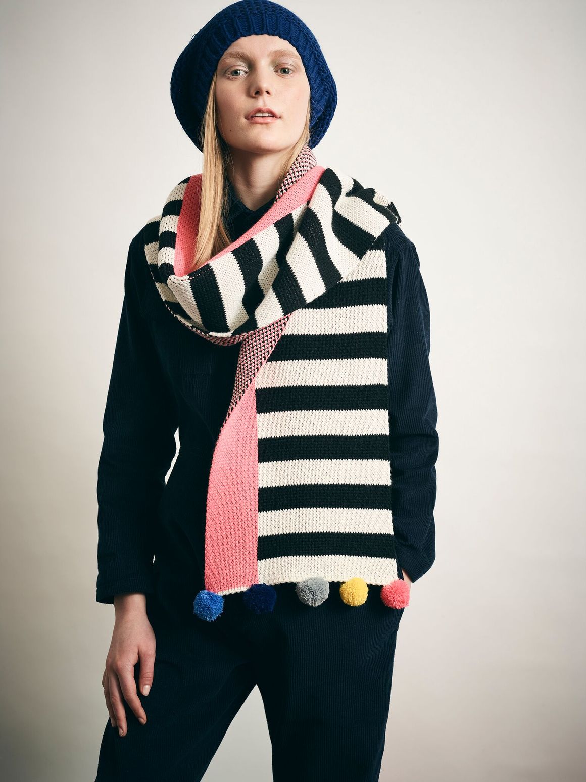 What’s not to love about this stunning pompom scarf by, you guessed it, Miss Pompom! Black and cream stripes run the full length of this accessory with one block line of pink filling the outer edge. Slightly slimmer in width than the usual Miss Pompom scarves, this quirky version is finished off with wonderfully cute mini pompoms.