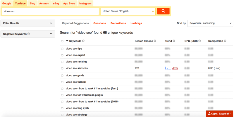 Additionally, Keyword Tool Pro adds numbers and letters to the target query to collect even more suggestions. With this paid feature, you can get twice as many results as you would in the free account, plus get accurate YouTube search volume estimates.