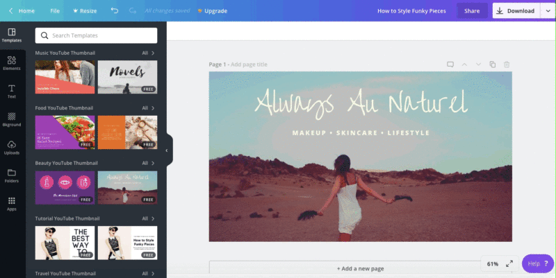 It should be noted that this tool is not exclusively used for creating thumbnails — Canva can also be engaged in a number of other design-related tasks such booklets, presentations, sales pitches and so forth. It offers over a million fonts, graphics, photos and templates for you to choose from, as well as the option to upload images from your collections.