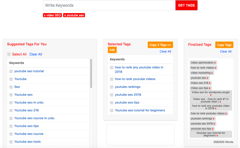The free version of the TagsYouTube tool enables you to get a list of tags related to your target keyword, select the ones you like, and add them to the final list of tags. You can then add another keyword and add those tags to your final list of tags as well. Continue adding keywords until you get a list of tags you are happy with.