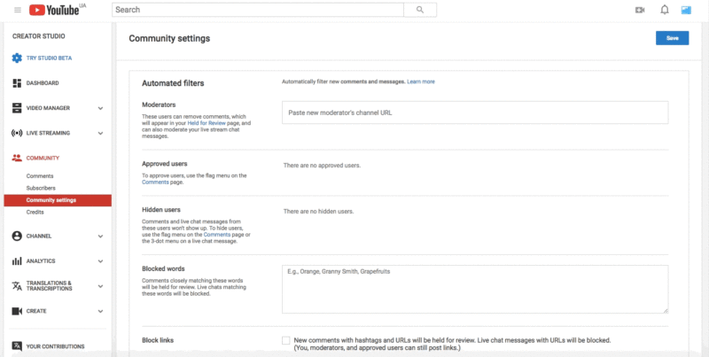 There, you can add users to enable their comments to be approved automatically. You can also view the comments left by users marked as ‘hidden’. Moreover, by entering a list of words you want to block, comments that match or closely match the specified words will be put aside for human review. Additionally, mark the checkbox next to the Block links option to hold back new comments and live chat messages with hashtags and URLs. Last but not least, configure the basic settings regarding comments on your videos, channel and live chat before hitting ‘Save’.