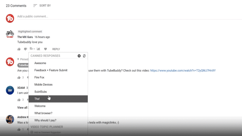 Canned responses is another helpful tool that allows creating quick go-to answers to popular viewer comments. Once you’ve prepared your short replies, you can select one right next to a user comment under the video, saving loads of time on creating messages anew.