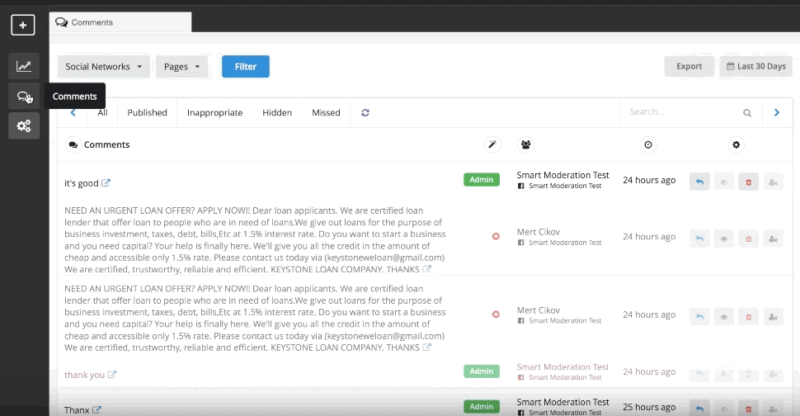 This is where Smart Moderation comes in. This tool connects to your social profiles on Facebook, Instagram and YouTube and deletes unwanted comments the moment they are posted. On top of that, the tool’s machine learning AI removes such comments very accurately — like a human would. This feature makes this solution stand out because it understands words like humans. Plus its intelligence engine can be trained as you continue using the service.