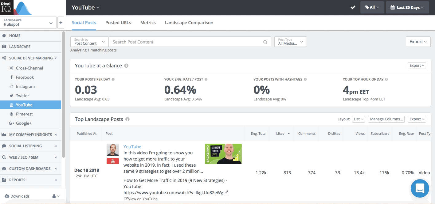 The way Rival IQ shows data is easy to process for analytical newbies and data scientists alike. The tool conveniently generates YouTube metrics right out of the gate, giving you an instant snapshot insight into your and your competitors’ channels — number of posts per day, the engagement rate per post, best time of day to post, as well as the usual suspects: likes, dislikes, views, subscribers, and comments.