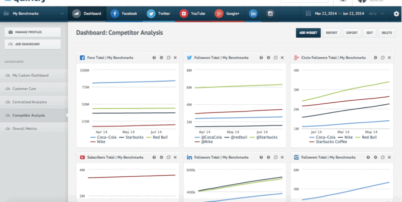 The easy-to-use paid web-based app called Quintly was created to enable companies to keep their eyes on their own social media accounts, set points of reference — against your figures or that of your competitors — and improve future campaigns. This solution provides data from Facebook, LinkedIn, Instagram, Twitter and, of course, YouTube.