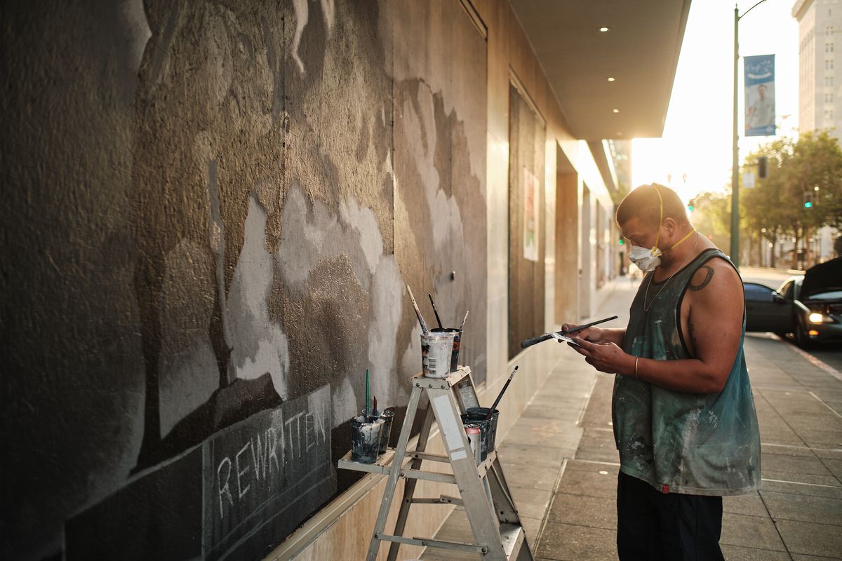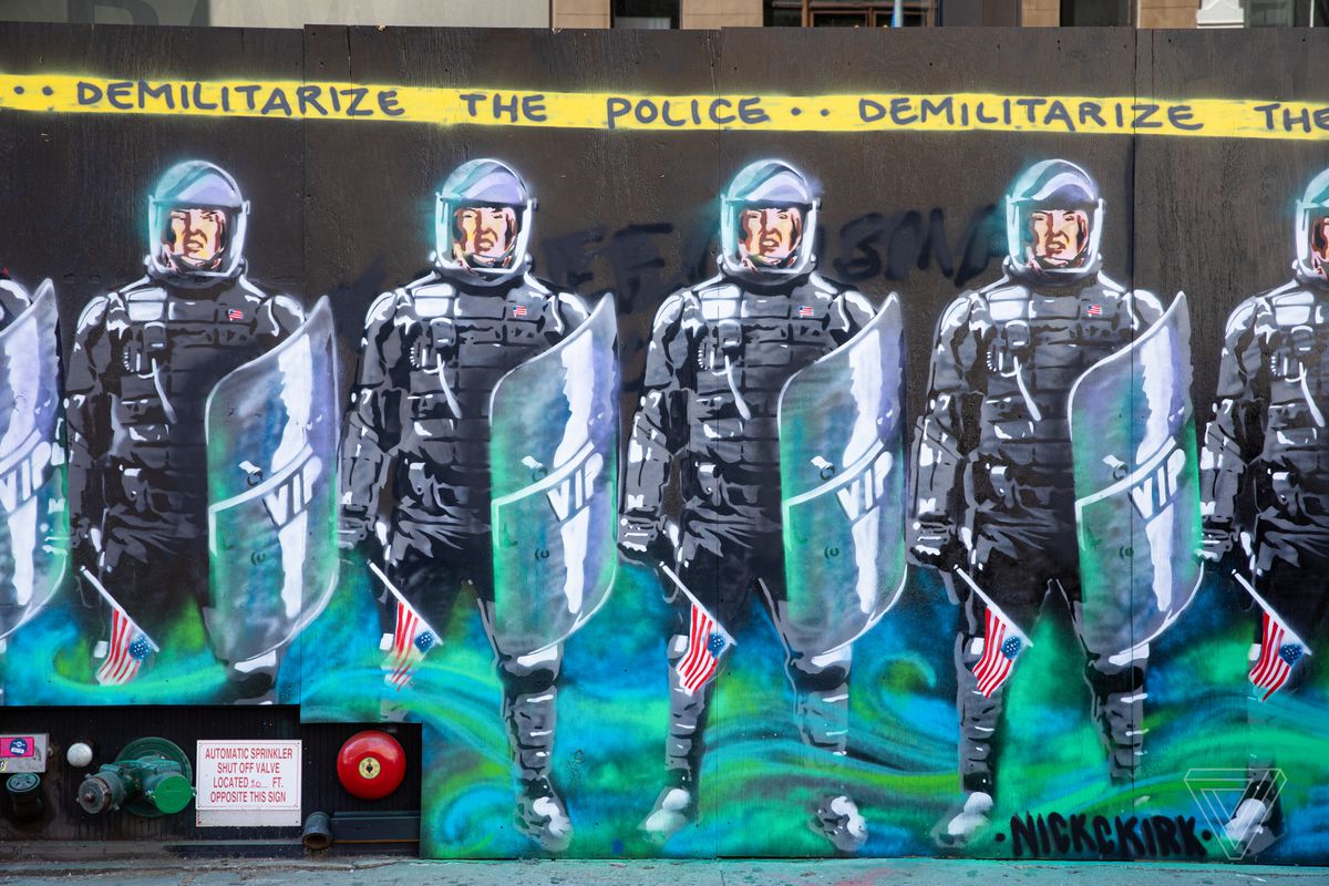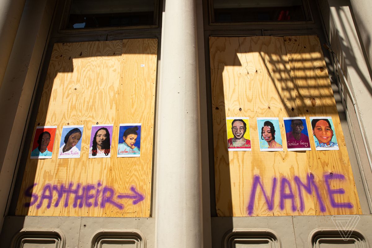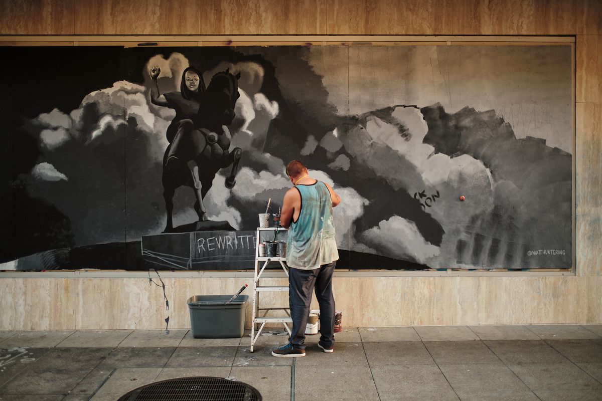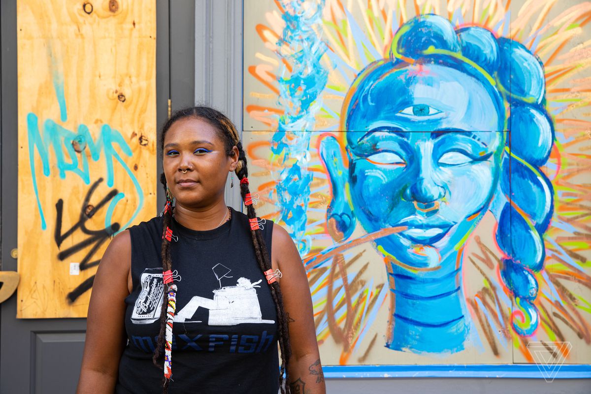 After finishing a mural of George Floyd on Broadway in downtown Oakland, Matt Hunter started painting his second one when The Verge caught up with him. This time, he decided to paint a mural of Breonna Taylor. It took him about three days to finish this monochromatic piece of Taylor depicted as “a new monument for a new future,” he said. “I feel as though there is a cycle of things and we are at a boiling point of ignored pain.”