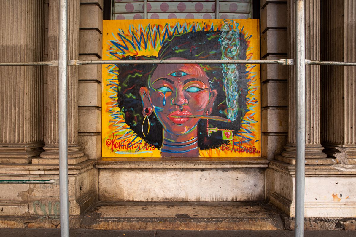 A mural by Konstance Patton on a boarded-up storefront on Broadway in Soho. Instagram: @konartstudio