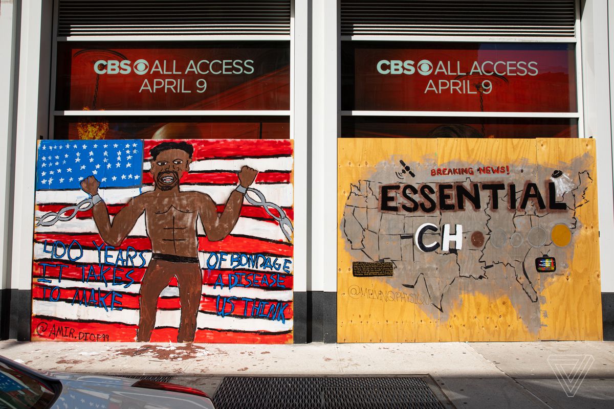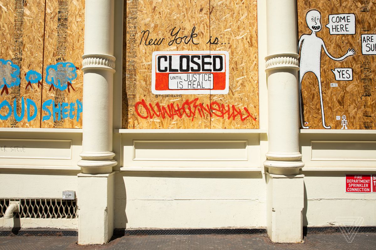 Left image: New York is Closed Until Justice is Real by @tylerivesnyc, and piece to the right by @saralynne.leo. Right image: unfinished piece by @jessekreuzer, see the completed work here.