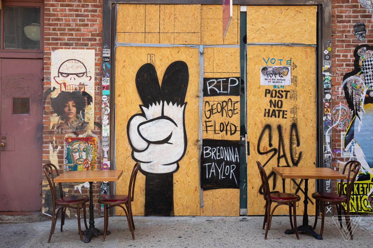 Left, piece by @ronhaywoodjones. Right, street artist Sacsix’s piece on a boarded-up storefront is the backdrop to empty cafe tables which mark the first day of “phase 2” in the reopening of New York’s economy since the shutdown from the COVID-19 pandemic. Instagram: @sacsix.