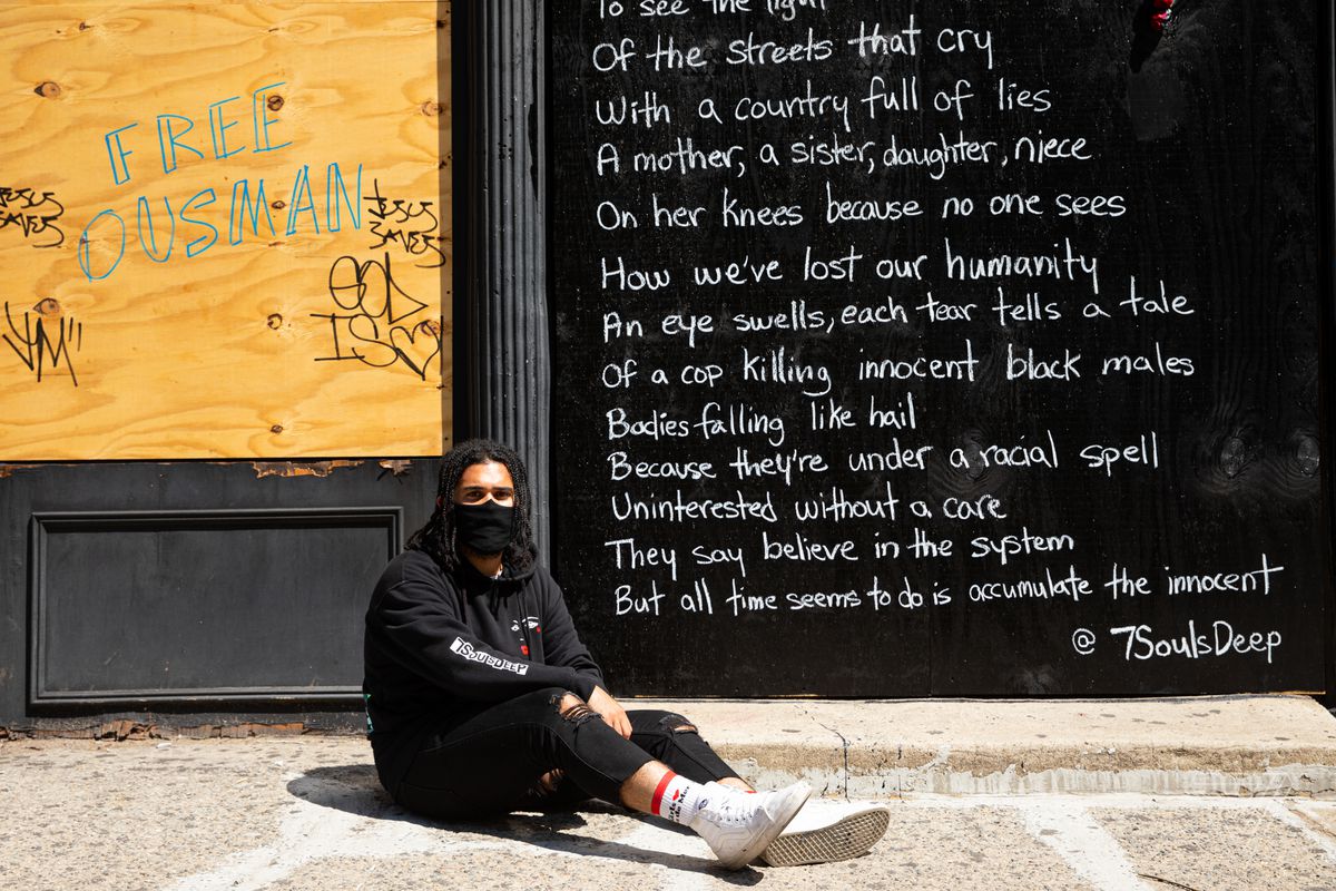 Kalima poses for a portrait in front of What is the price of our life. “This piece was actually written in 2016 because of the murder of Philando Castile which is why this piece is so important,” Kalima says in an email. “It allows you to see that nothing has changed, and that instead racism, law enforcement, our judicial system has shown it’s true colors into their intentions and unwillingness to do what’s right by black people.“ Instagram: @7soulsdeep.