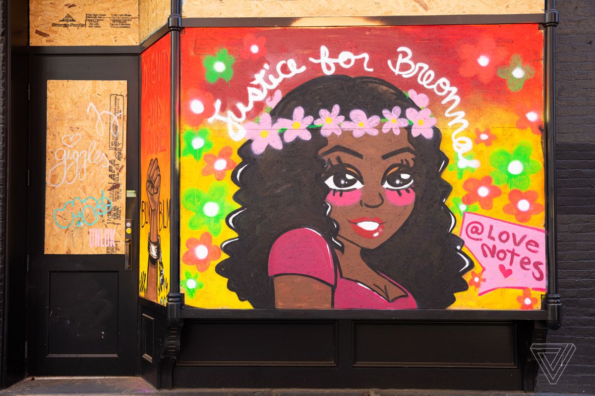 Mural artist Lola Lovenotes writes about her mural commemorating Breonna Taylor, who “was murdered over 3 months ago by police officers and they still have not been charged,” she said in a message over Instagram. “There have been countless racial injustices against Black women, girls, [transwomen + girls], and yet their names are forgotten. Their murders don’t seem to get the same attention as Black men and boys. When we say Black Lives Matter, we need to make sure Black women are included in our demands for justice too!” (The brackets are hers.) Instagram: @lovenotes.