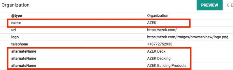 Example: AZEK utilizes alternate names of items within its Organization schema markup to highlight different brand name variations.