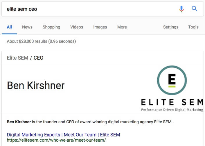 Many websites list employee profiles for their executive teams and others. There is an opportunity to mark up this information, which often includes the employee’s name, title and photo, and sometimes a short description, with schema Person markup. This can help your site to power knowledge graph results and appear in certain rich results for your employees.