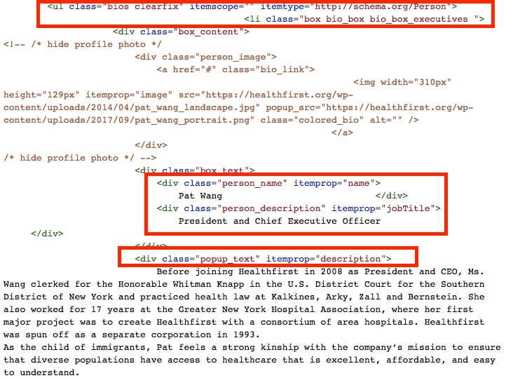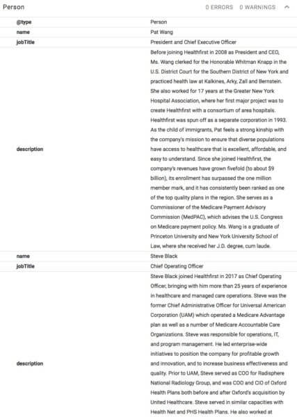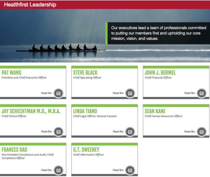 Example: Healthfirst utilizes schema Person markup on its Leadership page.