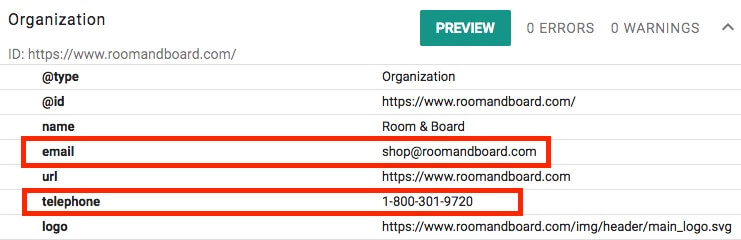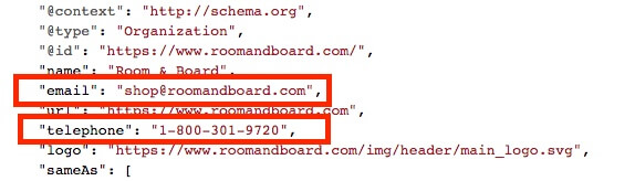 Example: Roomandboard.com highlights an 800 number and email address in their organization schema markup.