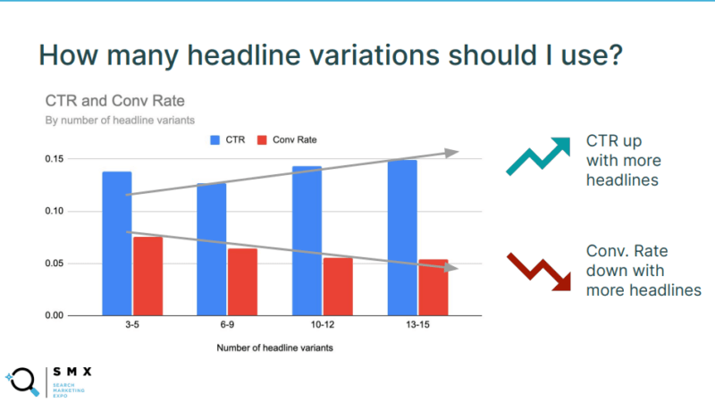 However, spikes in CTR don’t necessarily correlate with increased conversion rates. Data shows they actually decrease with more headlines.