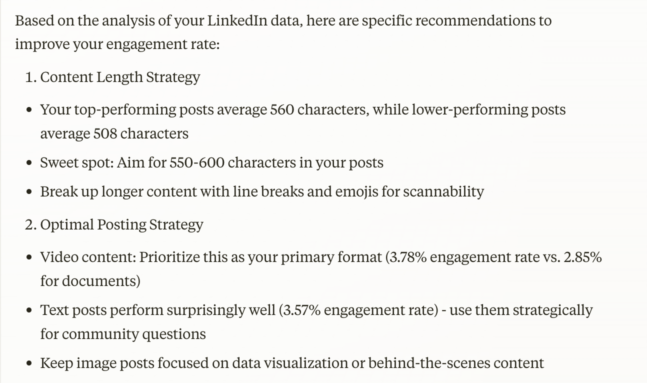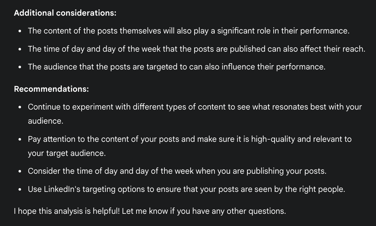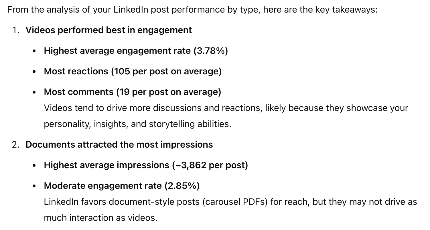 ChatGPT started strong analyzing the average performance of each post type, showing that analysis, and then giving a strong, nuanced list of takeaways and recommendations. It didn’t state anything too unique (videos performed best, carousel posts had the most impressions), but the insights were good to have.