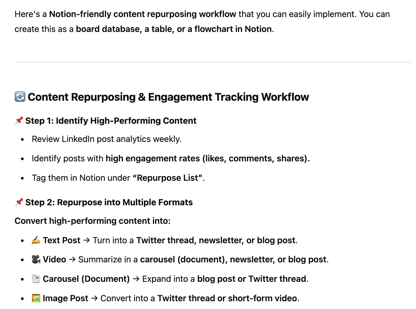 - Create a content workflow that helps me repurpose high-performing content and track engagement.