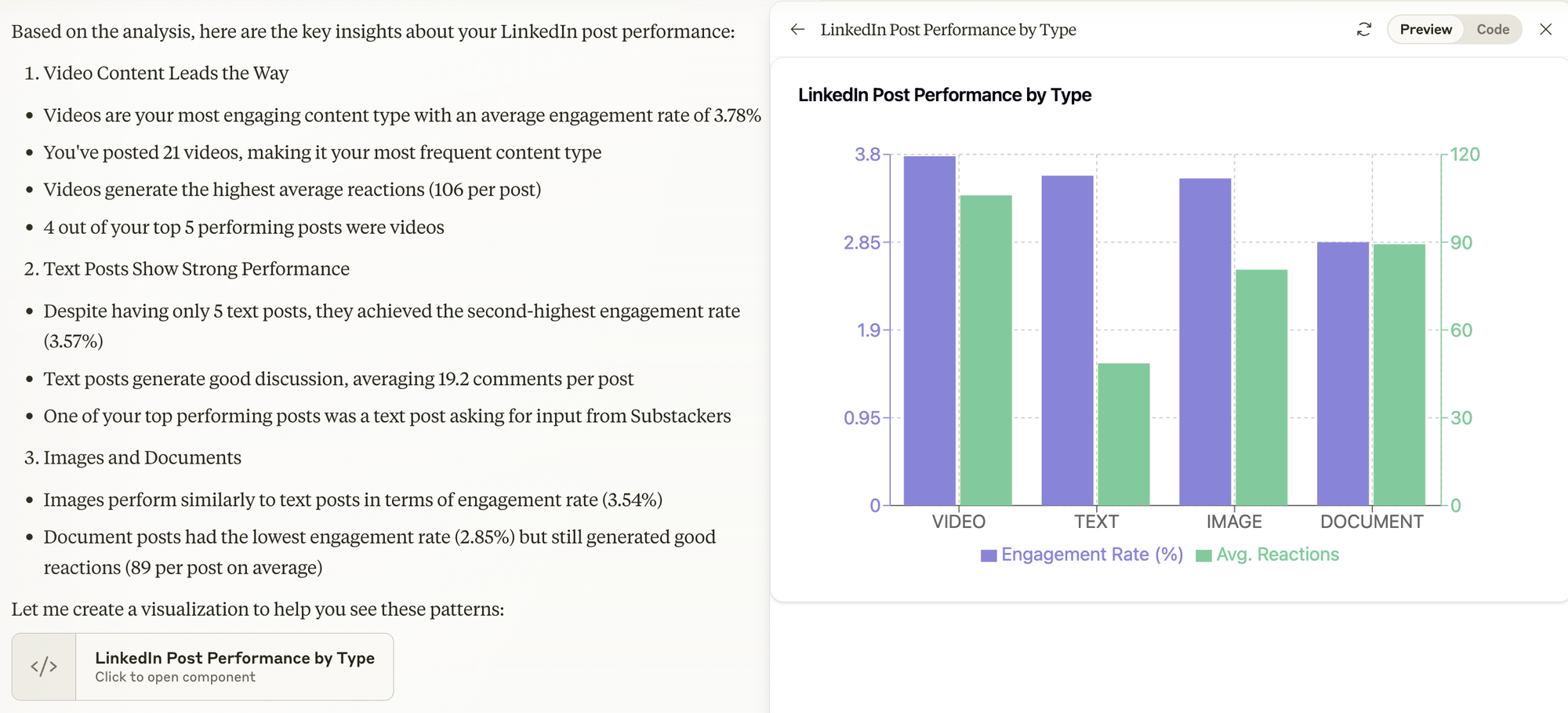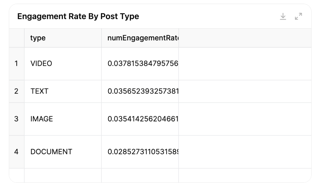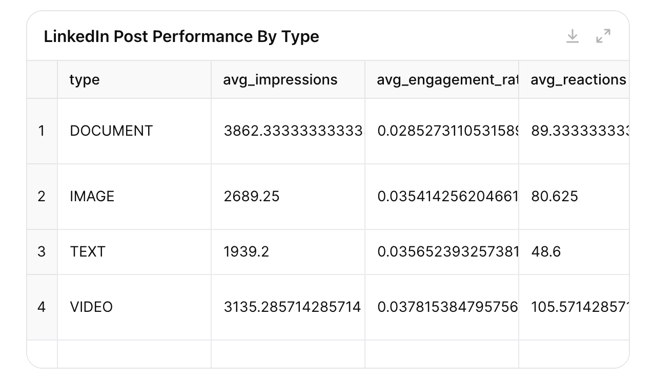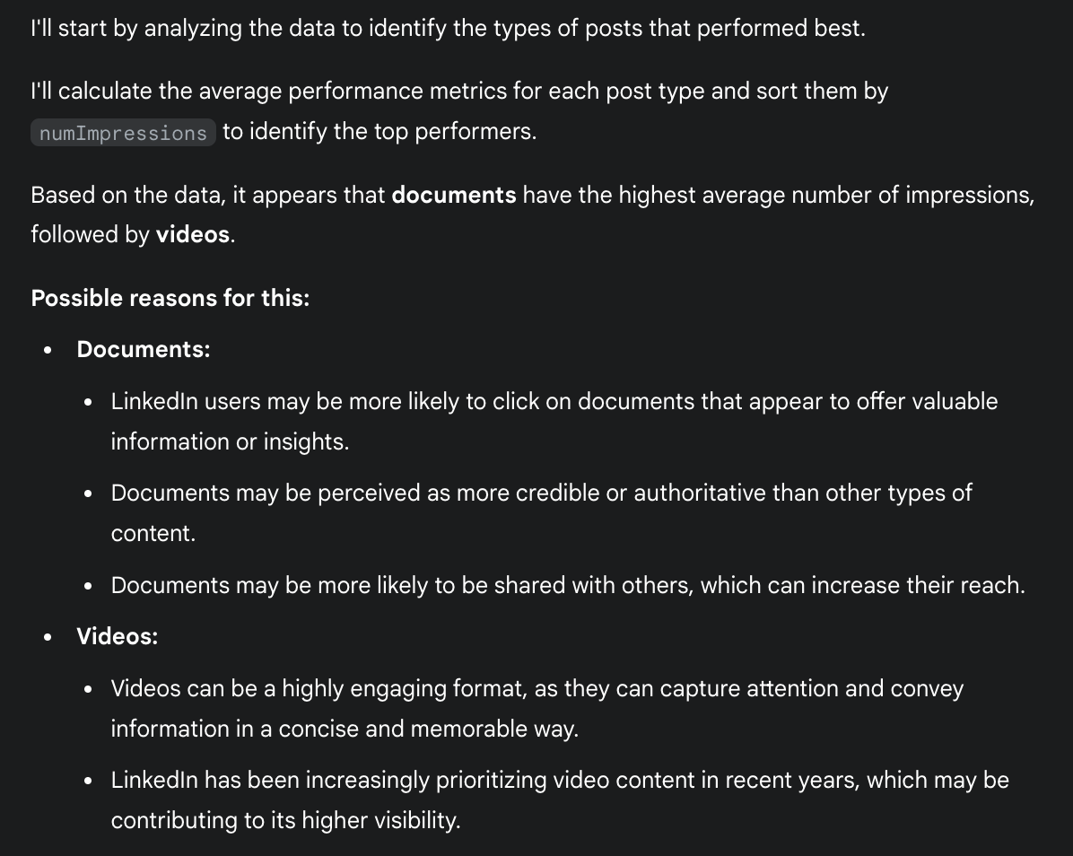 For example, in the first response, it failed to recognize that though my carousel posts (the Documents) received more impressions, they didn’t get as high engagement.