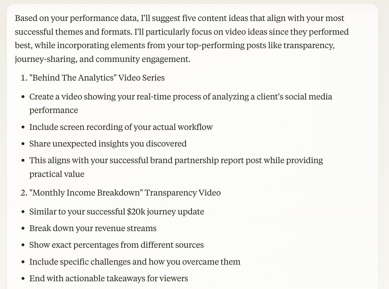 Claude had some interesting ideas on the content front, including a “creator tools revealed” video and a suggestion to ask a community question each week. However, interesting did not always translate to relevant, as it didn’t consider the actual content of the posts within the CSV file it had in its memory. Overall, the ideas shared weren’t as relevant to me and my content as they could have been.