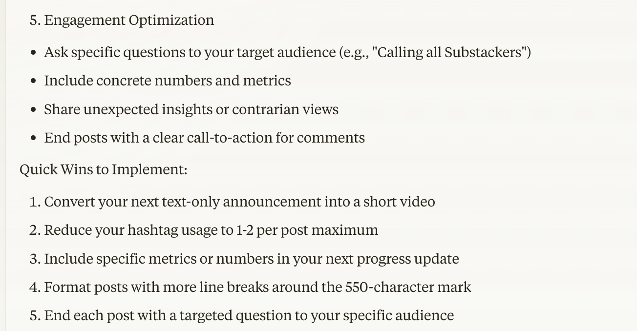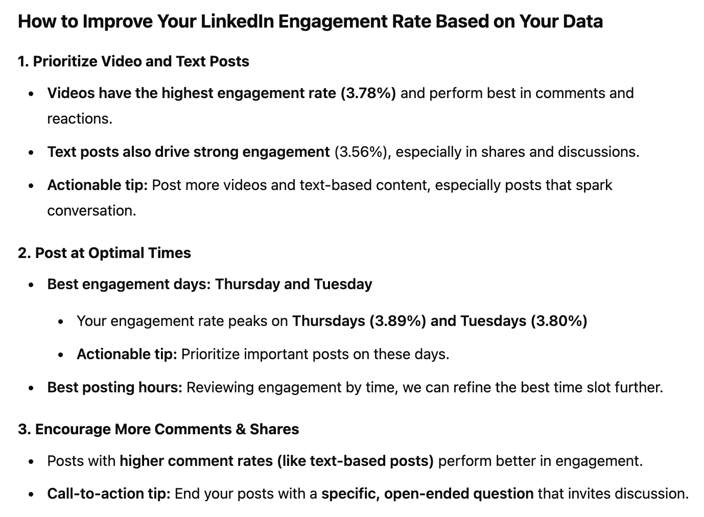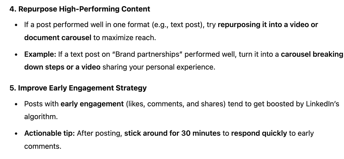 Then, more impressively, it gave a list of actionable tips, including the best time to post on LinkedIn according to my data — something none of the other tools did. Other suggestions it made were to prioritize video and text posts and improve my early engagement strategy by responding to the comments in the first 30 minutes of posting.