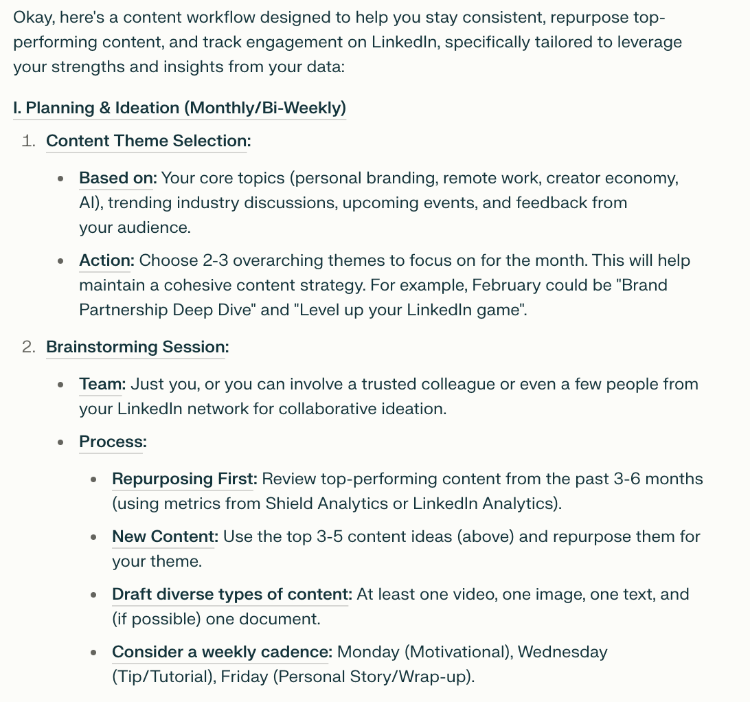 Perplexity also returned a pretty standard “AI made this” workflow that was good, but didn’t encourage any deeper thought for me. It did generate a helpful daily workflow that can fit nicely into my current approach to content, so I gave it points for that.