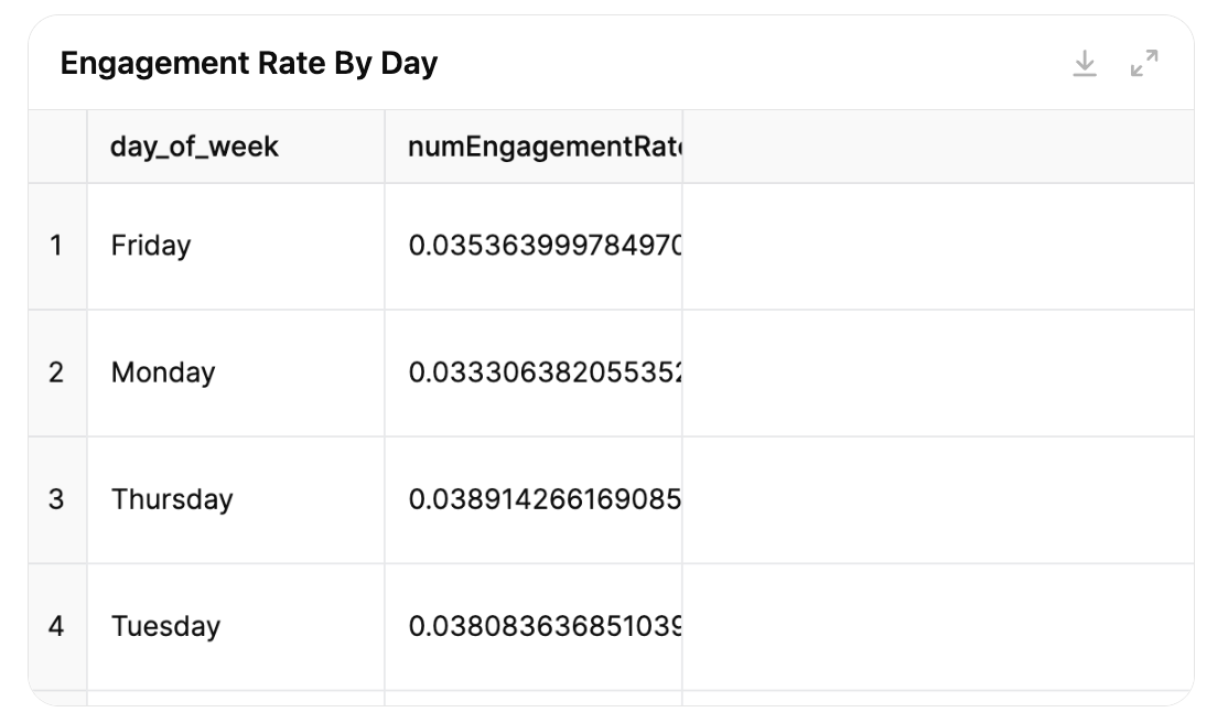 However, the request for engagement rate improvement ideas showed off ChatGPT’s data analysis capabilities even better. It broke down the engagement rate data by post type, day, and even hour.