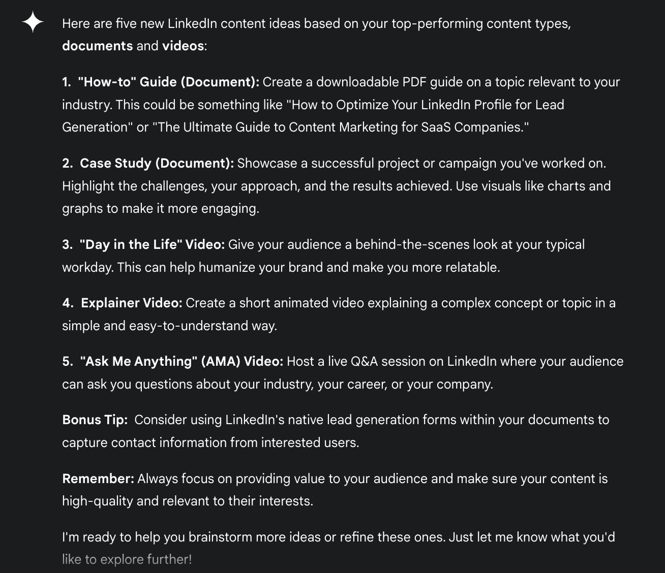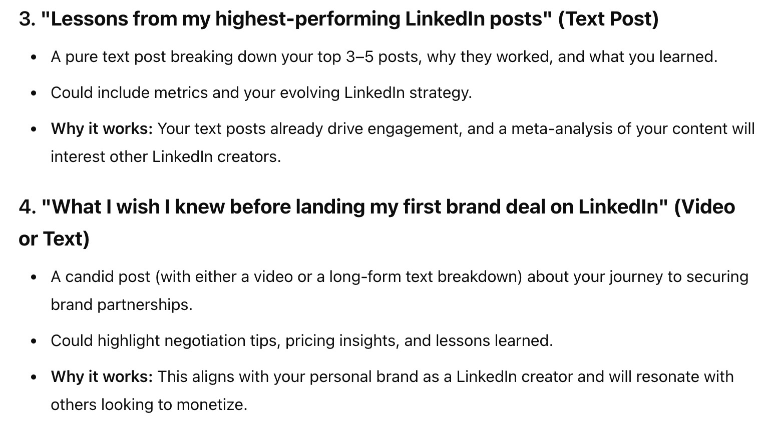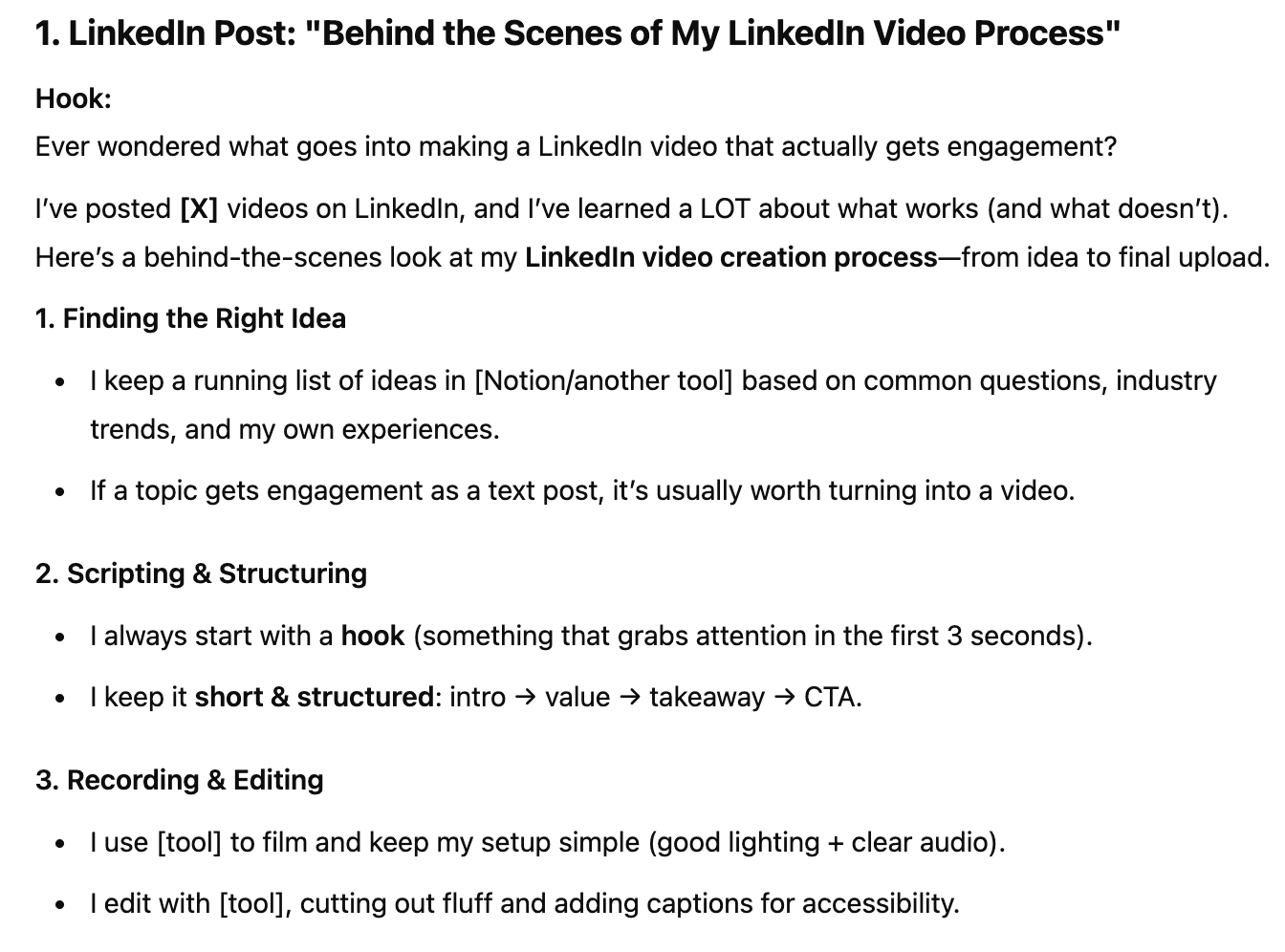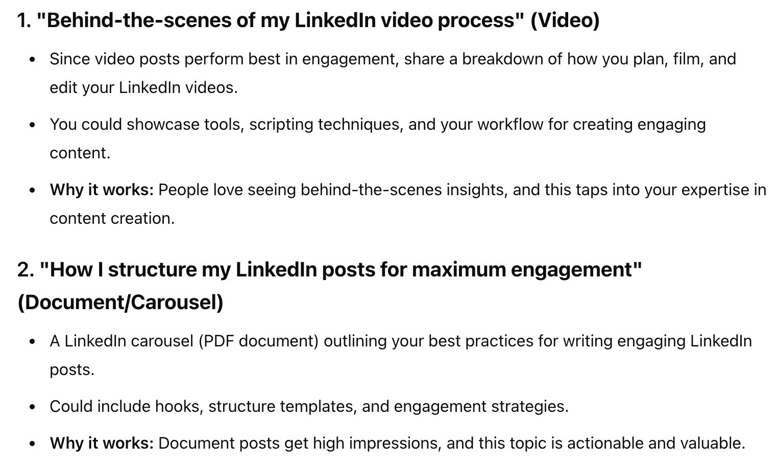 ChatGPT also really shined in delivering hyper-relevant ideas. When asked for unique content ideas, the bot gave me a list that played off my existing high-performing topics and formats. For example, it recommended I share a behind-the-scenes of my LinkedIn video process, an idea I’ll definitely be using.