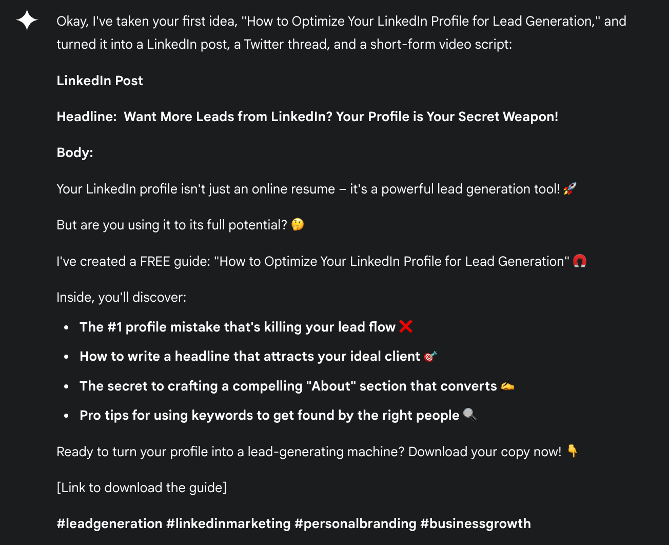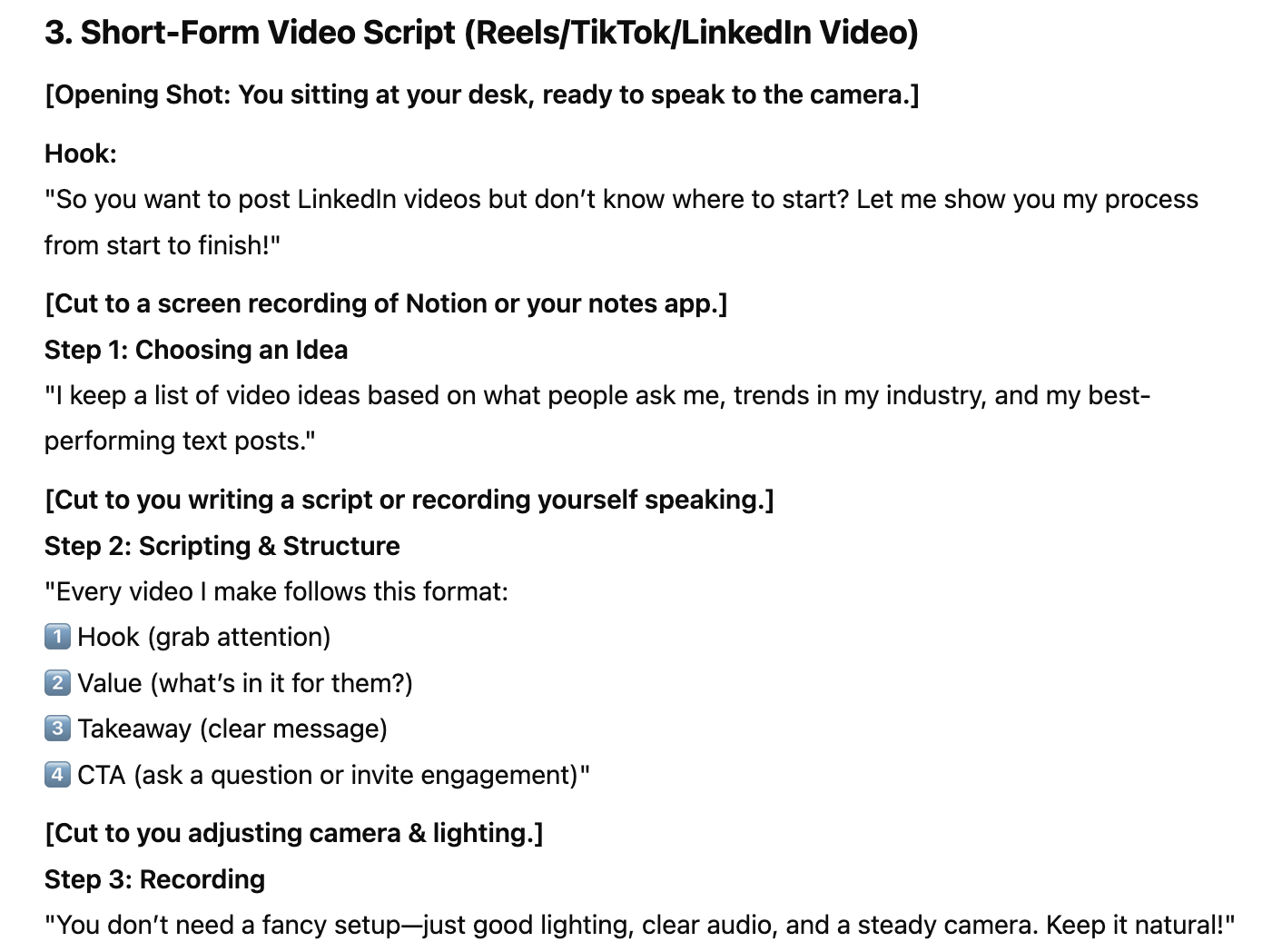 - Take the best-performing idea and turn it into a LinkedIn post, a Twitter thread, and a short-form video script.