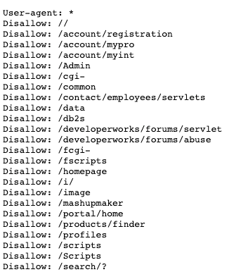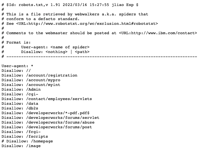 Using this, you can analyze how the robots.txt has changed over time. For instance, IBM’s robots.txt file looks quite different from what it used to. Here is the file back in 2012: