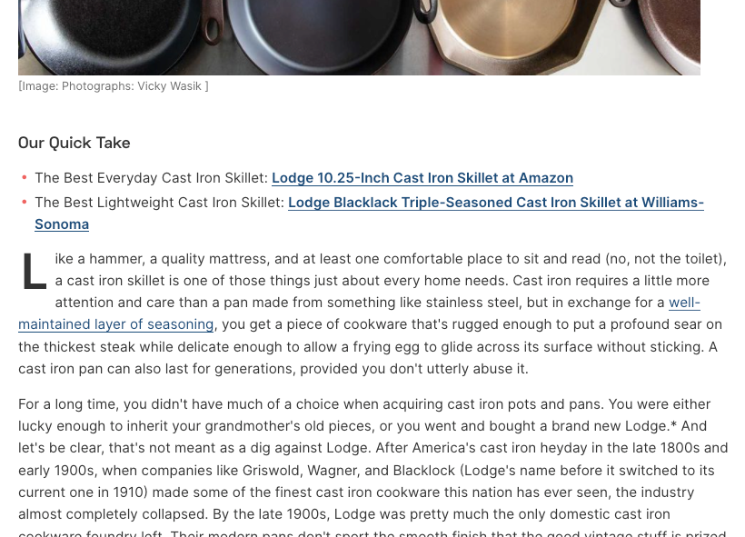 For example, we can use The Wayback Machine to look at the best cast iron skillet page from Serious Eats on June 27, 2021: