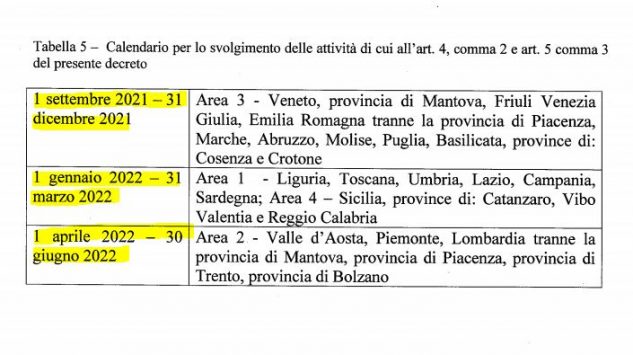 - Area 3: Veneto, Friuli-Venezia Giulia, Emilia-Romagna tranne le province di Parma e Piacenza, Marche, Abruzzo, Molise, Puglia, Basilicata, Province di Cosenza e Crotone.