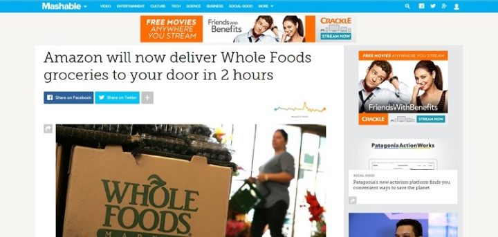Mashable is a good example of using a big graphic under the headline to help tell the reader what the story is about. In the screenshot above, the article is about Amazon’s new ability to deliver Whole Foods groceries to some customers. The image makes it clear that the article is about Whole Foods. Providing a quick graphic that helps the user process what the piece is about is particularly useful to mobile users who are likely to skim through articles.