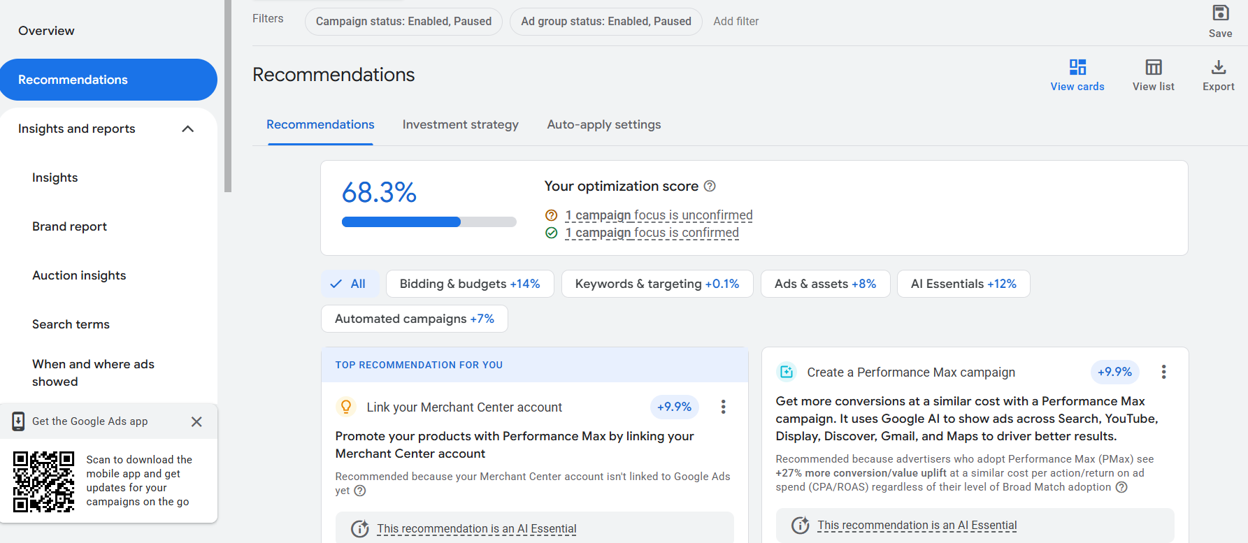 This is also where an account’s “Optimization Score” lives, and applying or dismissing recommendations directly impacts that score.