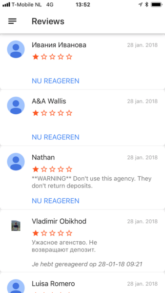 In this example, a business in Amsterdam received many one-star reviews from the same person who was also sending them threatening emails. In these cases, the reviews are usually left all at once and in a short period of time.
