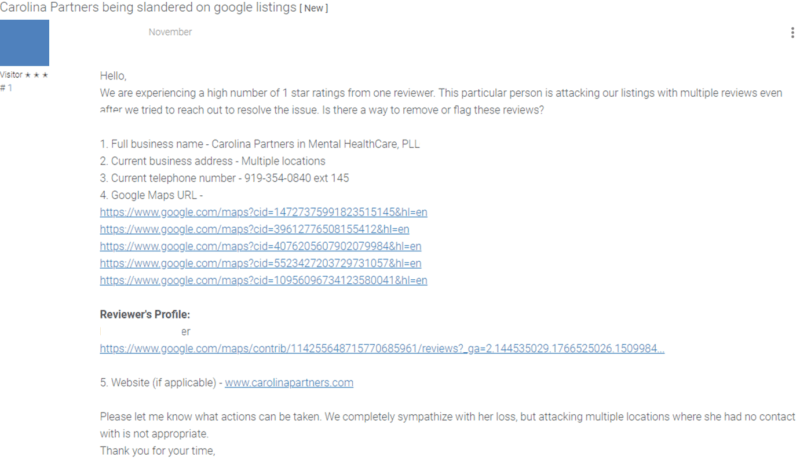 The reviewer in this example left one-star reviews for five locations of this mental health facility. Again, it is highly unlikely one person would be a patient at all locations and experience the exact same issues, so the reviews were removed.