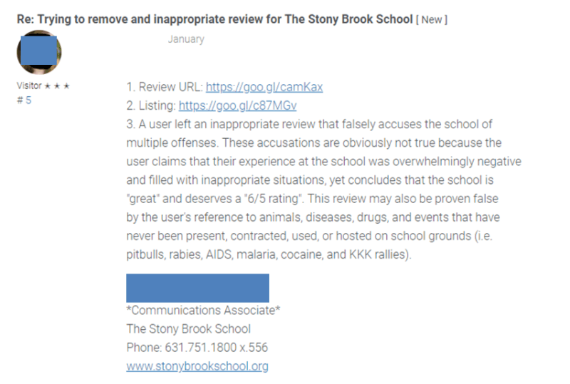 The person leaving the review claimed the school offered him an illegal drug and was affiliated with racist organizations. (Note: The original review has been removed. This is the school’s response.)