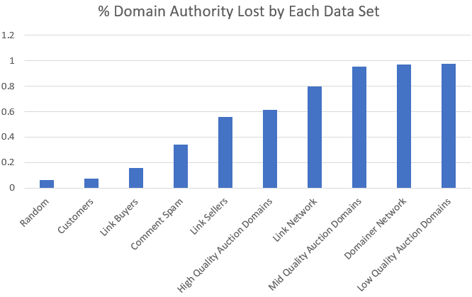 Continuing with the pattern regarding the quality of auction domains, you can see that “mid-quality” auction domains dropped nearly 95% in Domain Authority. This is huge. Bear in mind that these drastic drops are not combined with losses in correlation with SERPs; rather, the neural network is learning to distinguish between backlink profiles far more effectively, separating the wheat from the chaff.