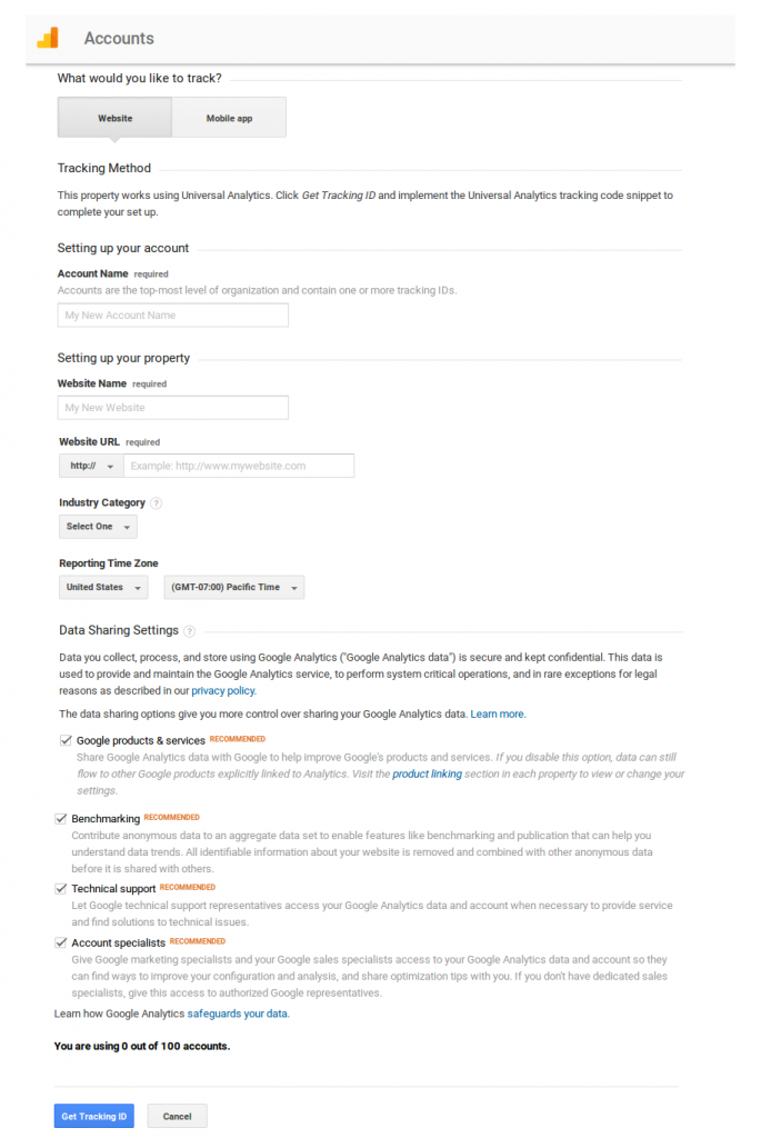 • Finally, get your Tracking ID by agreeing to Google’s terms of service usage.