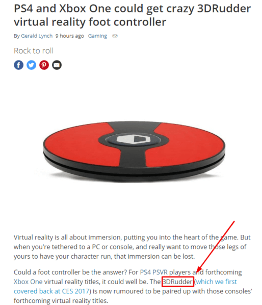 The company 3dRudder (no affiliation) has a foot controller used to enhance a virtual reality experience. I noticed they have an unlinked mention opportunity on TechRadar: