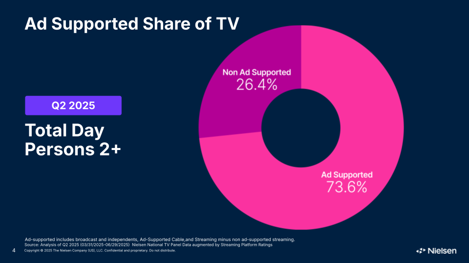 According to Nielsen’s Ad Supported Gauge, which provides the broadest view of the portion of television that delivers advertising across broadcast, cable, and streaming, content with ads viewing accounted for 73.6% of overall TV viewing, up +1.2 share points during the second quarter of 2025.
