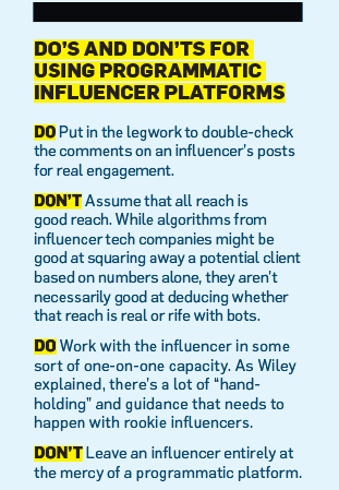 “If we’re recruiting for a program, we might need 20 influencers and get 200 applicants,” said Danielle Wiley, CEO of influencer agency Sway Group. Rather than sorting through each one, Wiley said that her agency programmatically pulls data about the reach and engagement rates of the would-be influencers. She can also check to make sure they’re a good fit in other ways, like whether they’re the right age to reach their demographic.