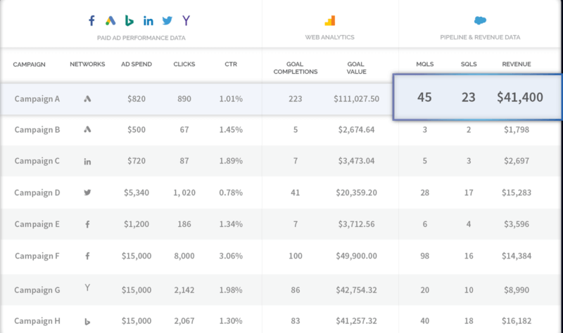 To give marketers the full view of how their campaigns perform for the sales team, Join brings together campaign data from search and social channels such as Google, Bing, Facebook and LinkedIn, on-site behavioral data from Google Analytics and lead and sales data from Salesforce.