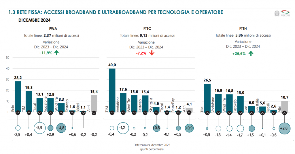 Relativamente al segmento delle linee in fibra (FTTH), complessivamente in crescita del 26,6% rispetto a dicembre 2023, Tim detiene il primo posto con il 26,5% degli accessi, ed è seguita da Vodafone (16,9%), Wind Tre (16,8%), Fastweb (15,0), Iliad (6,0%), Sky Italia (5,6%) e Tiscali (2,6%).