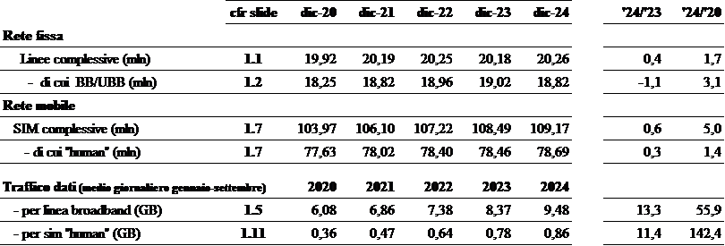 Continua la crescita del consumo di dati: in termini di volume complessivo, il traffico medio giornaliero nel corso del 2024 ha segnato una crescita del 13,8% rispetto al 2023 e del 65,2% rispetto al corrispondente valore del 2020. Ciò si riflette sul traffico giornaliero per linea broadband; i dati unitari di consumo, infatti, sono aumentati del 55,9% rispetto al 2020, passando da 6,08 a 9,48 GB per linea in media al giorno.
