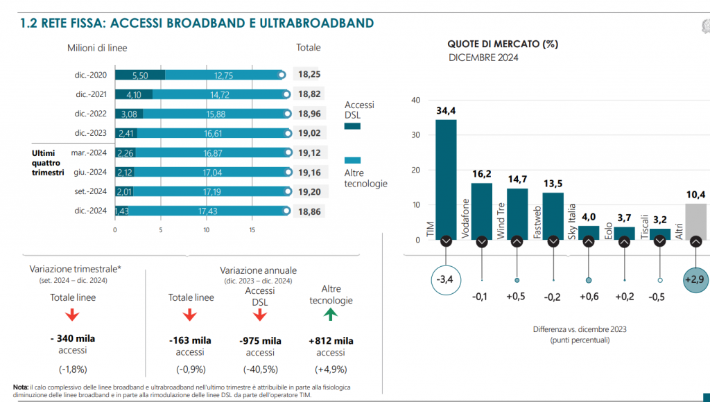 Le linee in rame si sono ridotte di circa 178 mila unità su base trimestrale e di poco meno di 700 mila rispetto al dicembre 2023, mentre nell’ultimo quadriennio sono diminuite di 4,30 milioni di unità.