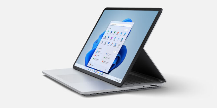 The Surface Pro 8 got a major update today, but the biggest reveal was the all-new Surface Laptop Studio, a high-end convertible with dedicated graphics that provides a step-up in speed from the regular Surface Laptop. The “Surface Studio” name is borrowed from the (aging, and still not updated) Surface Studio desktop, and the Laptop Studio’s screen bends forward and uses the laptop’s base as a stand in much the same way. Most of the time, the Laptop Studio just looks like a regular laptop, but its display can be pulled out over the keyboard into “stage mode” and tilted to whatever angle is most comfortable for what you’re doing. It can also fold all the way down into “studio mode,” which covers the keyboard and trackpad entirely and makes the laptop into one big tablet.