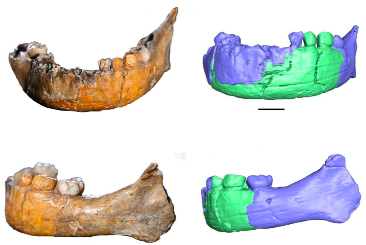 The original mandible of Skhu ¯ l I and the CT scan-based images in anterior and left lateral view. In blue, the bone; in green, reconstruction. Dan David Center of Human Evolution, Tel Aviv University